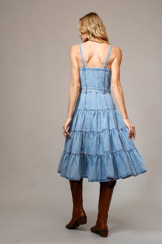 Meet The Hadley ... a tiered denim midi dress that nails that modern western vibe. Designed with a flattering zip-up front, adjustable waist tie, and softly washed cotton-blend denim for that lived-in look you love. Dress it up with boots for rodeo season or keep it casual with sandals and a sun hat.