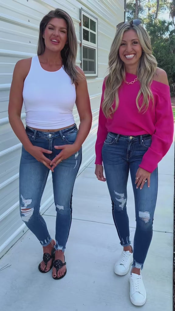 Meet Macy…your new go-to pair for everyday style with a little attitude. These mid-rise skinnies feature the perfect medium blue wash with subtle fading and distressing for that lived-in look.