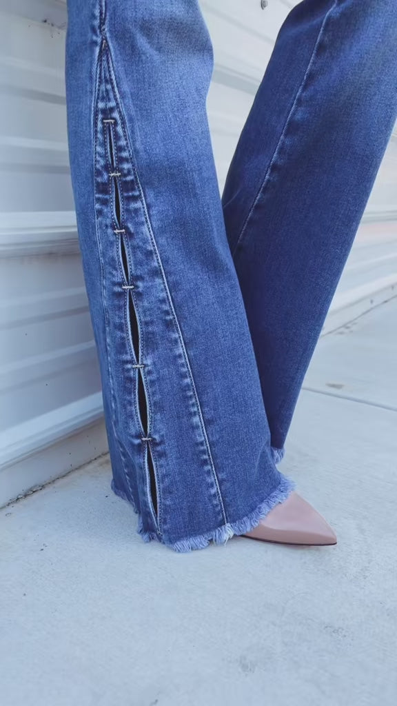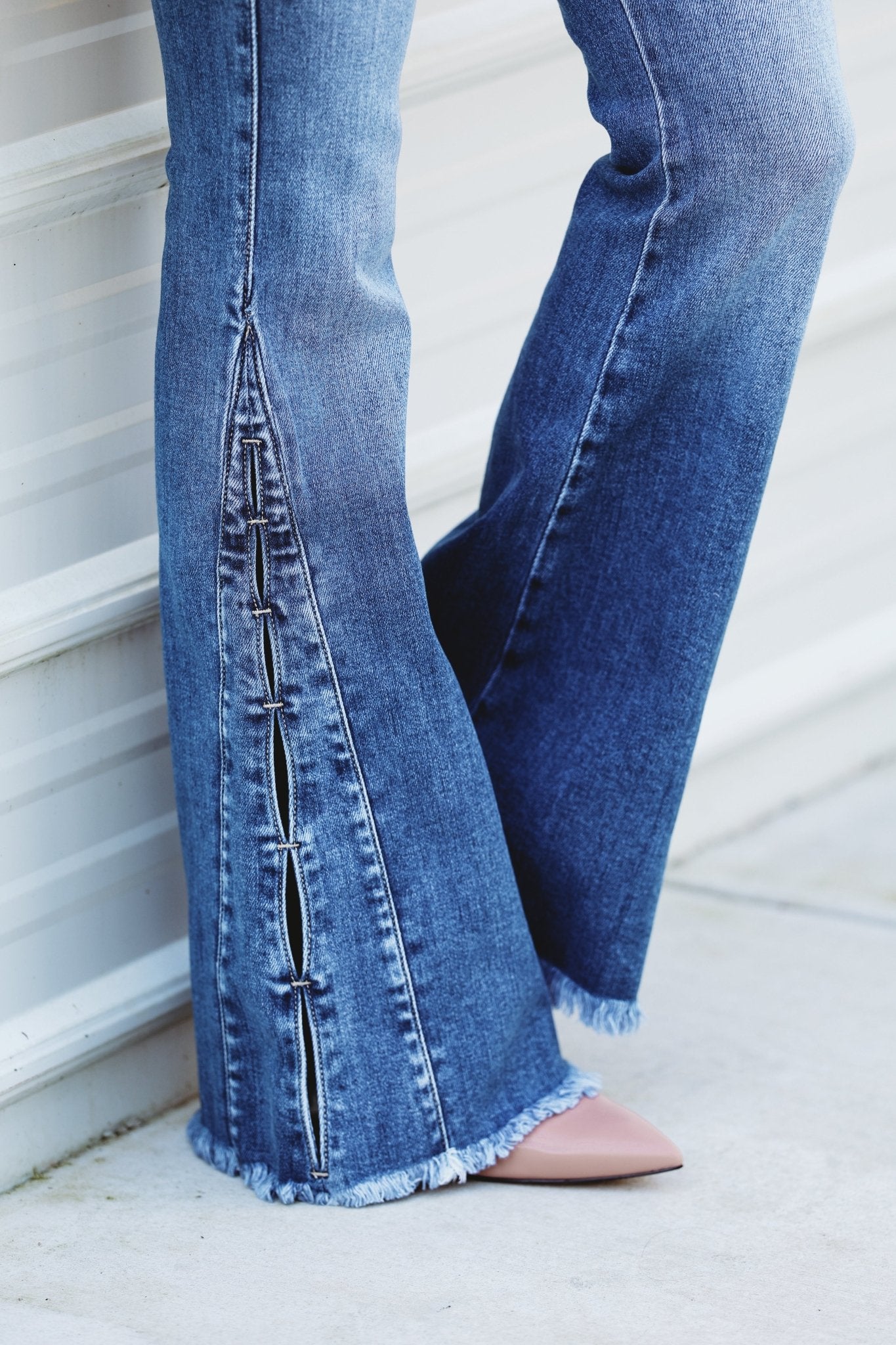 - High Rise Flare with raw hem and open pieced detailing along the flare