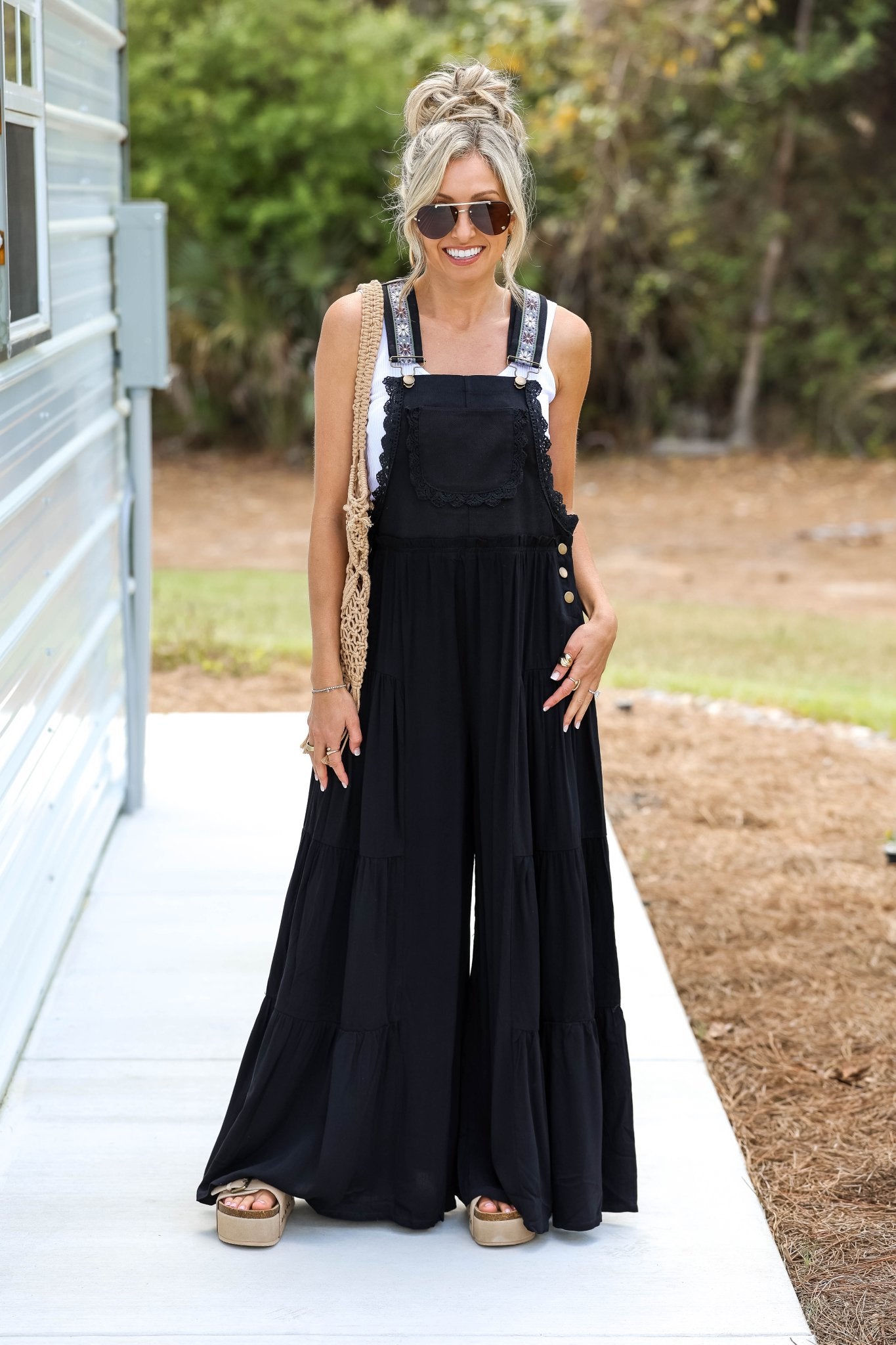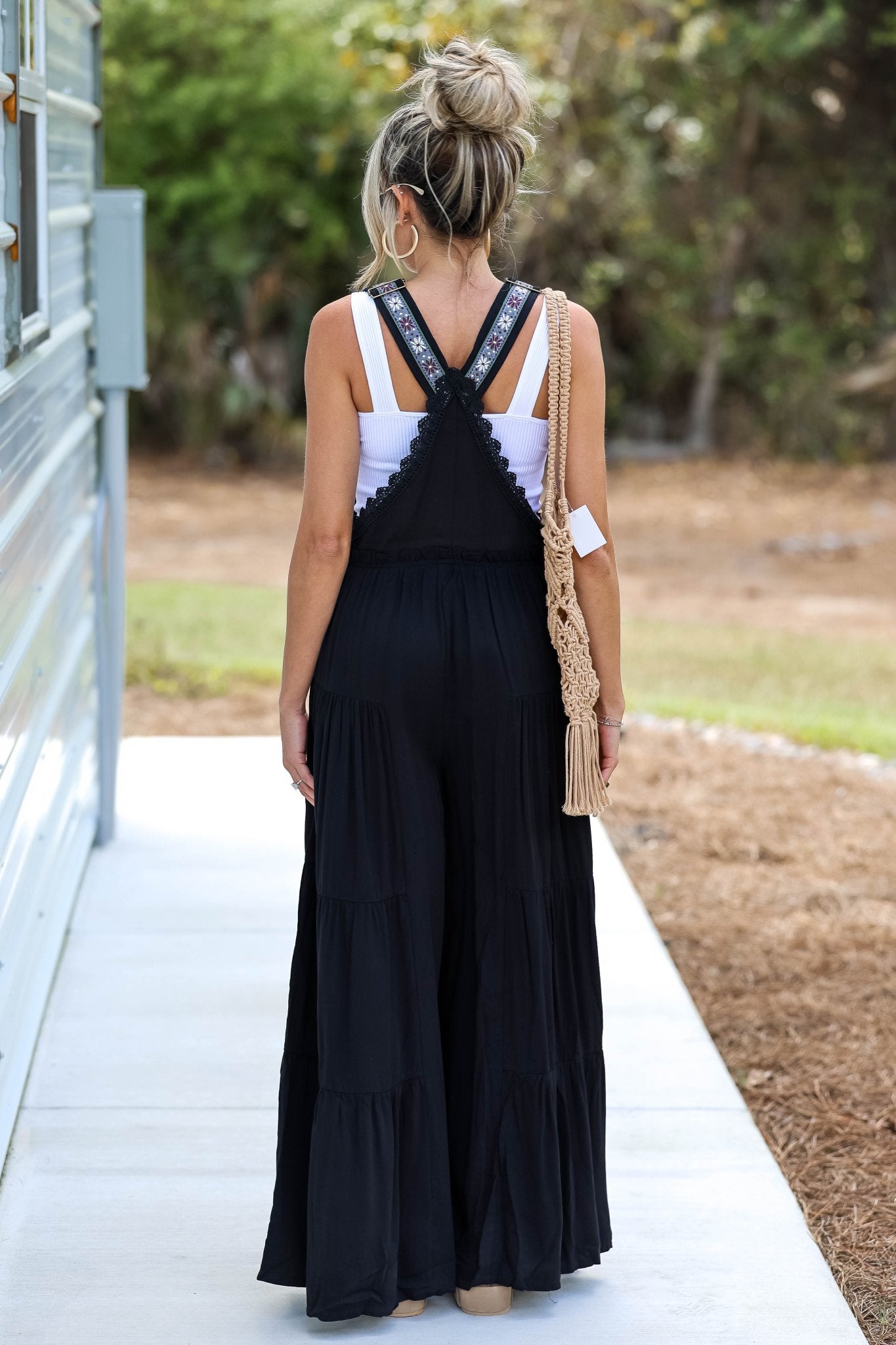 Free Spirit Lace Trim Wide Leg Black Overalls