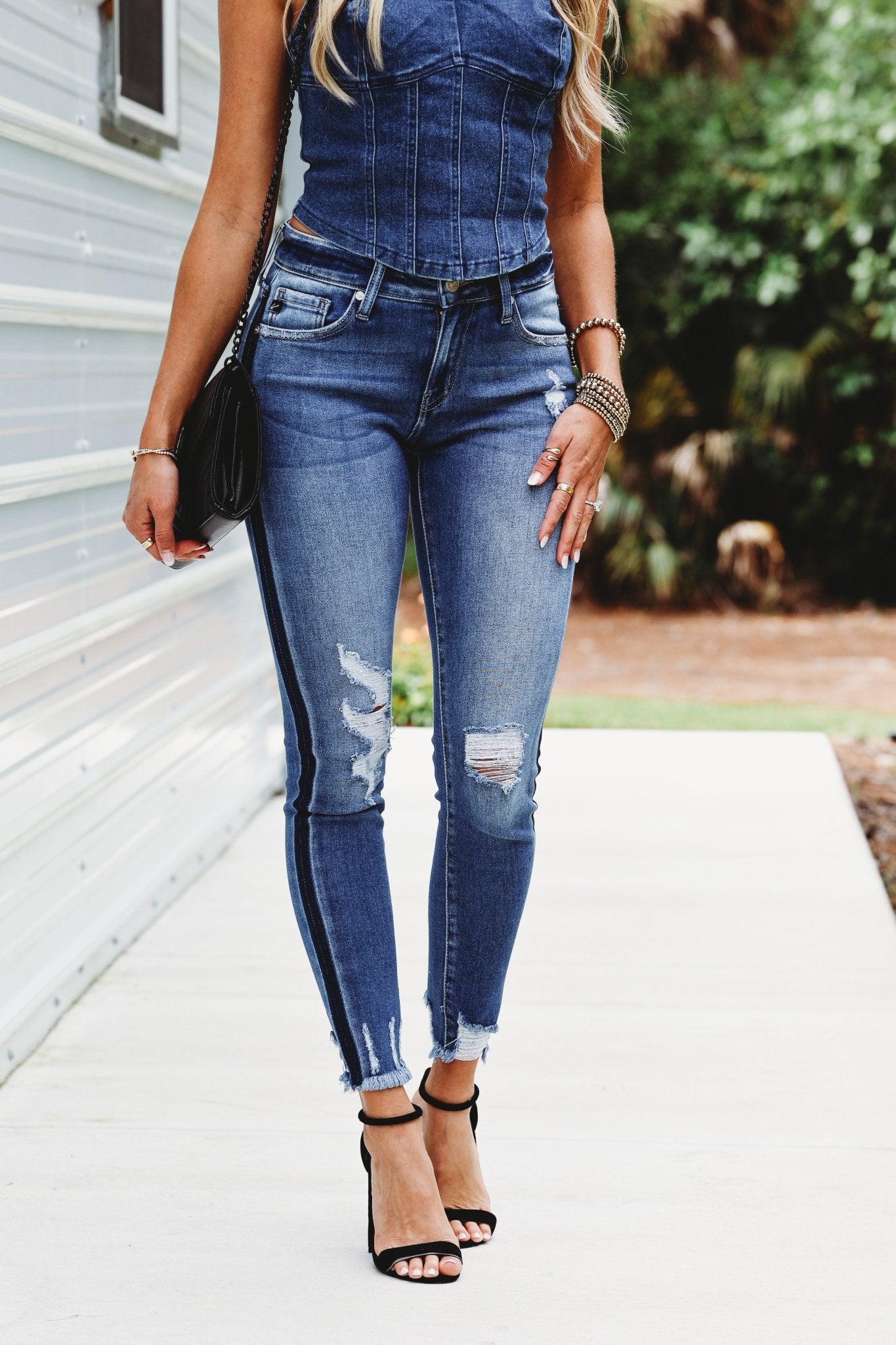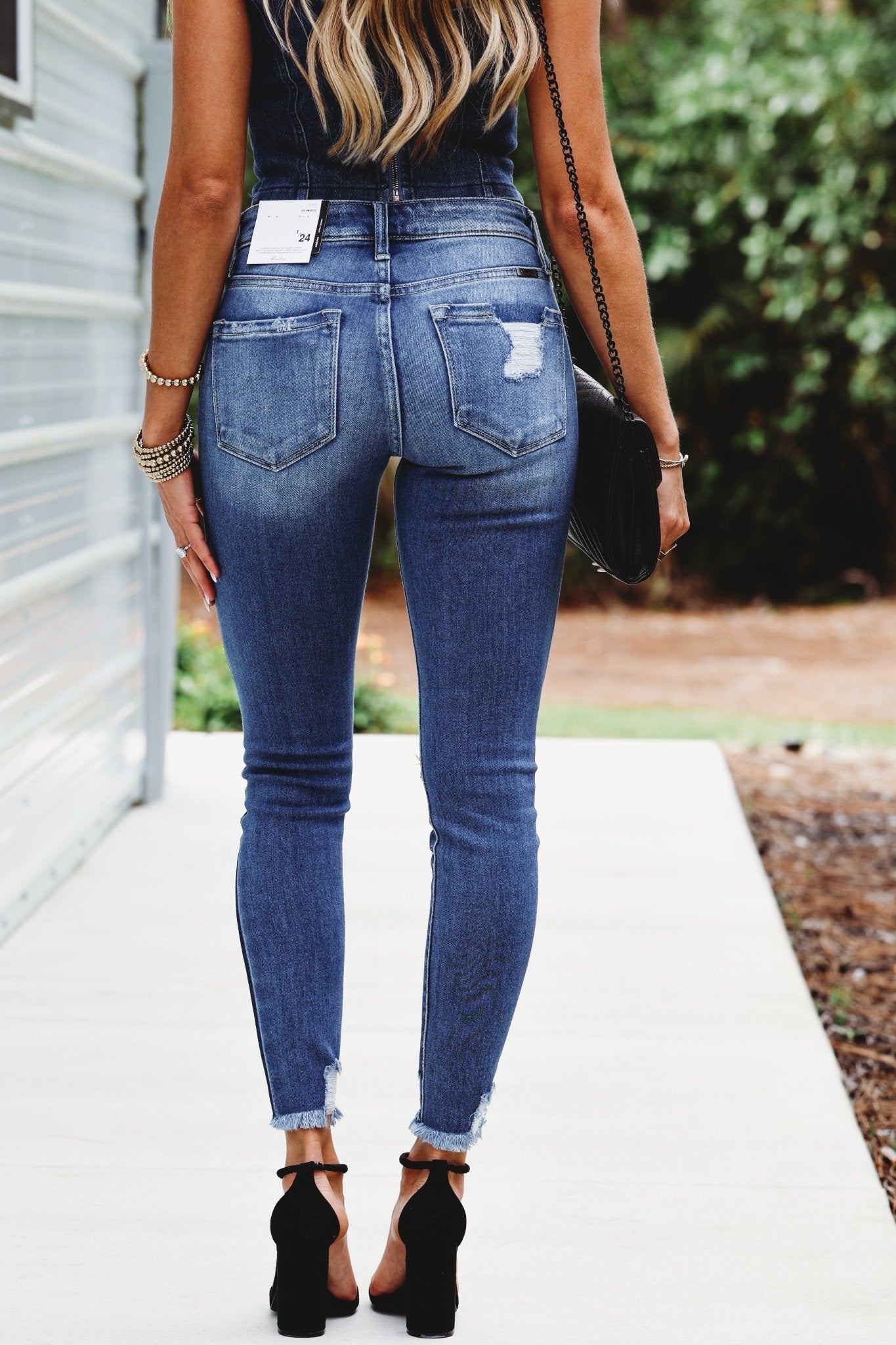 Meet Macy…your new go-to pair for everyday style with a little attitude. These mid-rise skinnies feature the perfect medium blue wash with subtle fading and distressing for that lived-in look.