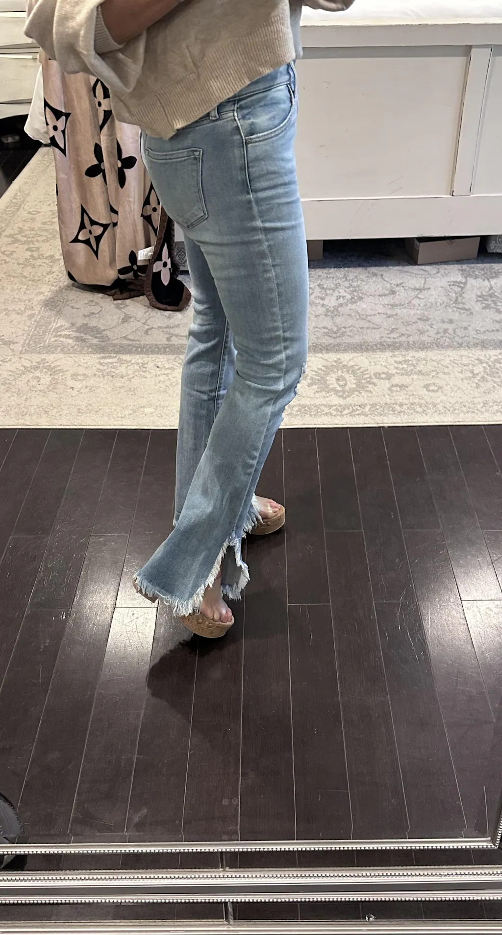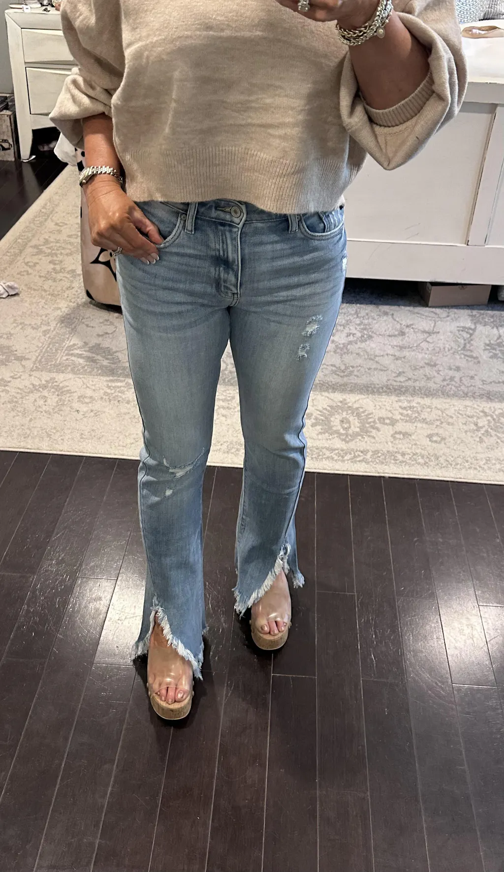 Great jeans. True mid rise and the fringe bottom is such a great touch!