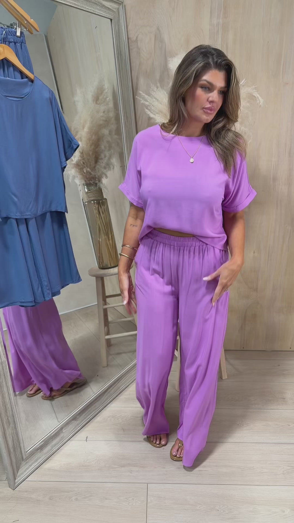 This two piece set features a relaxed-fit cuffed sleeve top and wide-leg elastic waist pants with pockets. Whether you're headed to brunch or working from home, this set makes you look put together without even trying.