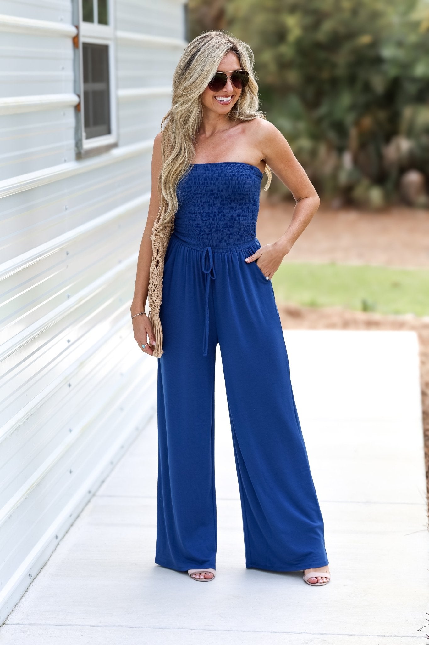 Oh-so-comfy, this strapless jumpsuit is your go-to for laid-back days or casual outings. Featuring a smocked bodice for a flattering, stay-put fit and flowy wide-leg pants for ultimate comfort, it's perfect for everything from brunch dates to beach strolls. The adjustable drawstring waist adds a touch of style. Pair it with sandals and a straw clutch for a breezy vibe or dress it up with heels for a relaxed yet elevated look. Style made simple!