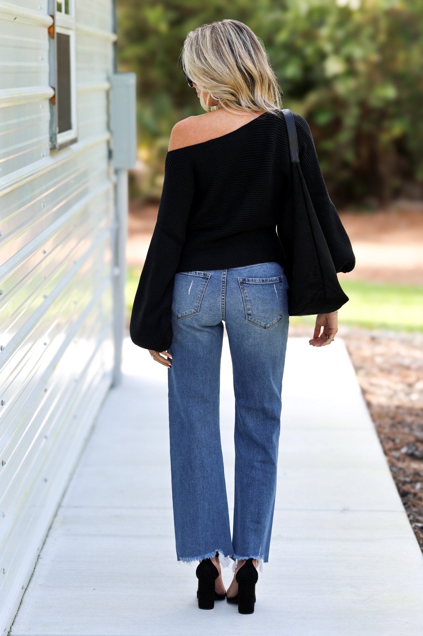 Black Cozy Ease Boat Neck Balloon Sleeve Sweater