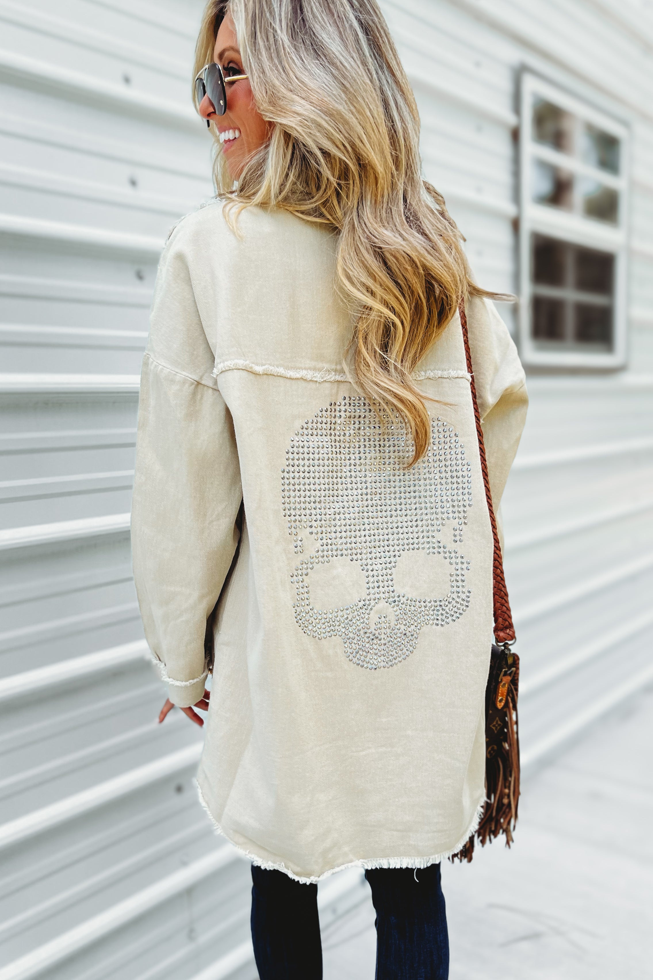 A little edgy, a lot cool...The Lennon Skull Jacket is your new layering favorite. Made in a washed denim with an oversized fit and studded skull design across the back, it’s the statement piece your closet’s been waiting for. Wear it over a graphic tee and jeans for a laid-back vibe or throw it on with leggings and sneakers for off-duty cool.