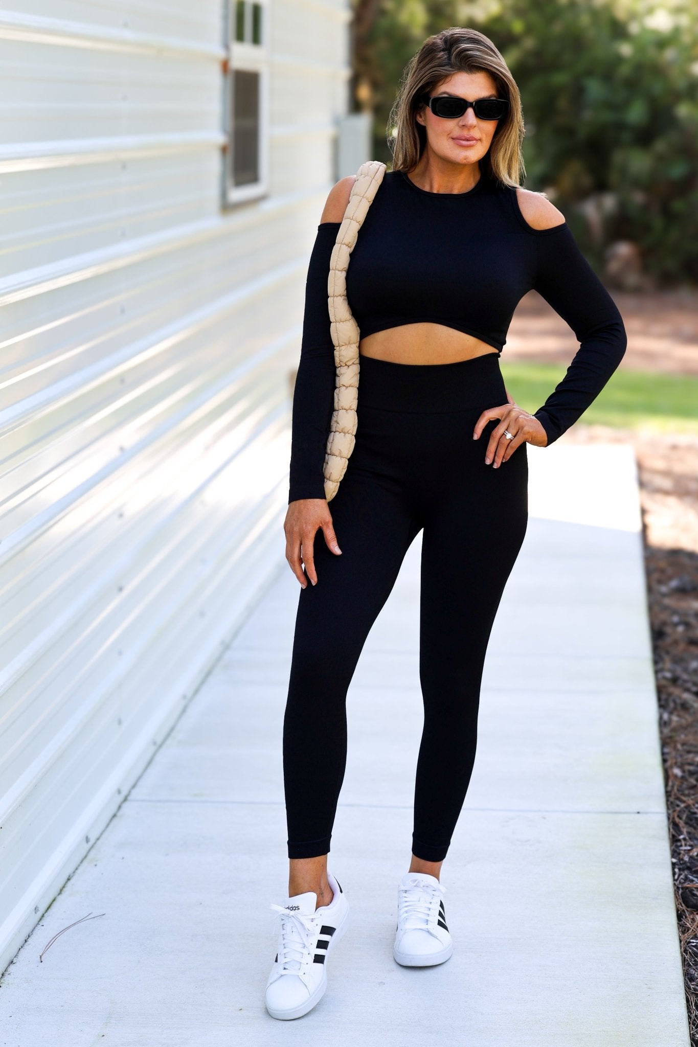 This two-piece features a sleek cold-shoulder long sleeve crop top that pairs perfectly with the high-waist leggings.