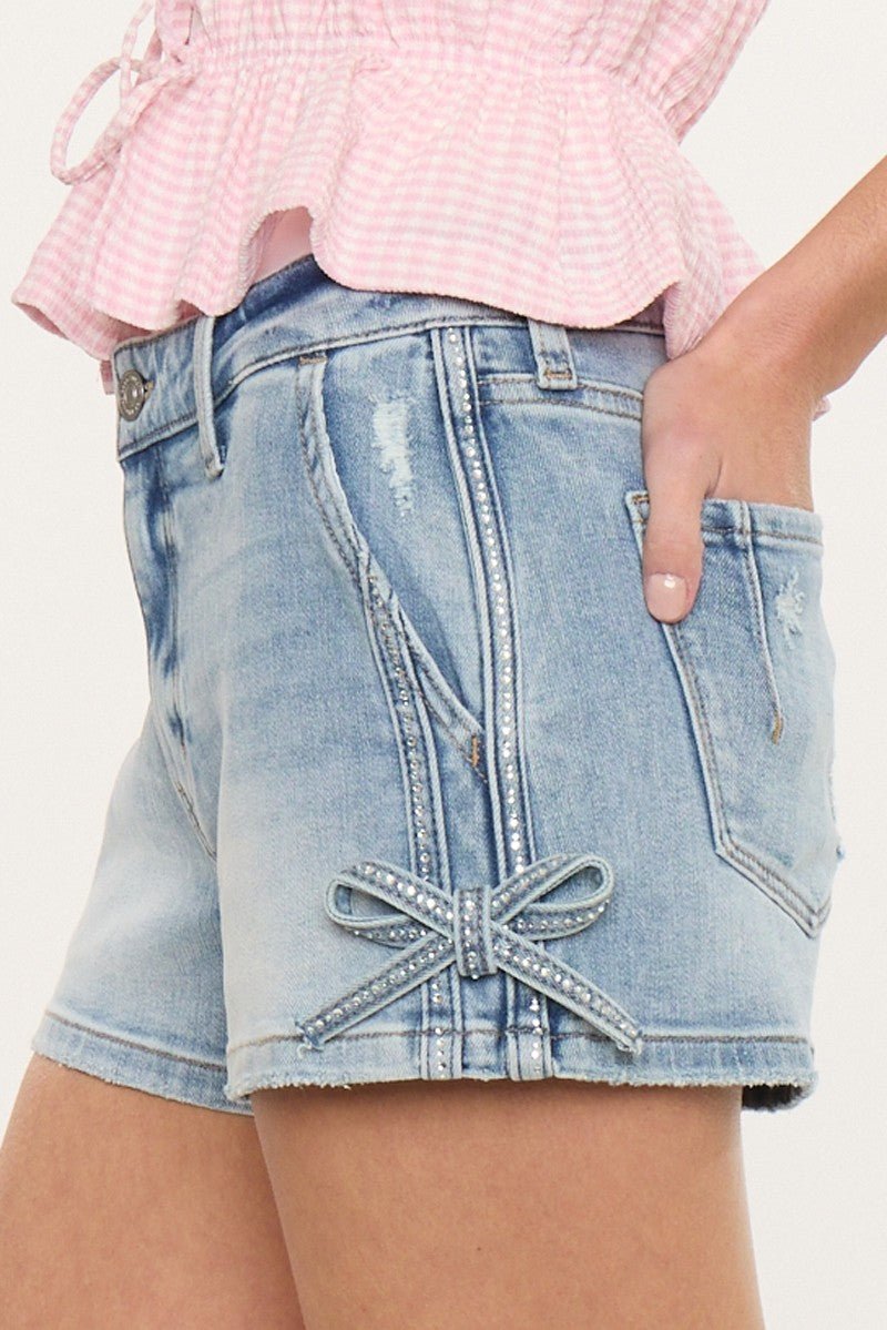 (PREORDER Ships 10 days) KanCan Bella Mid Rise Rhinestone Bow Denim Shorts