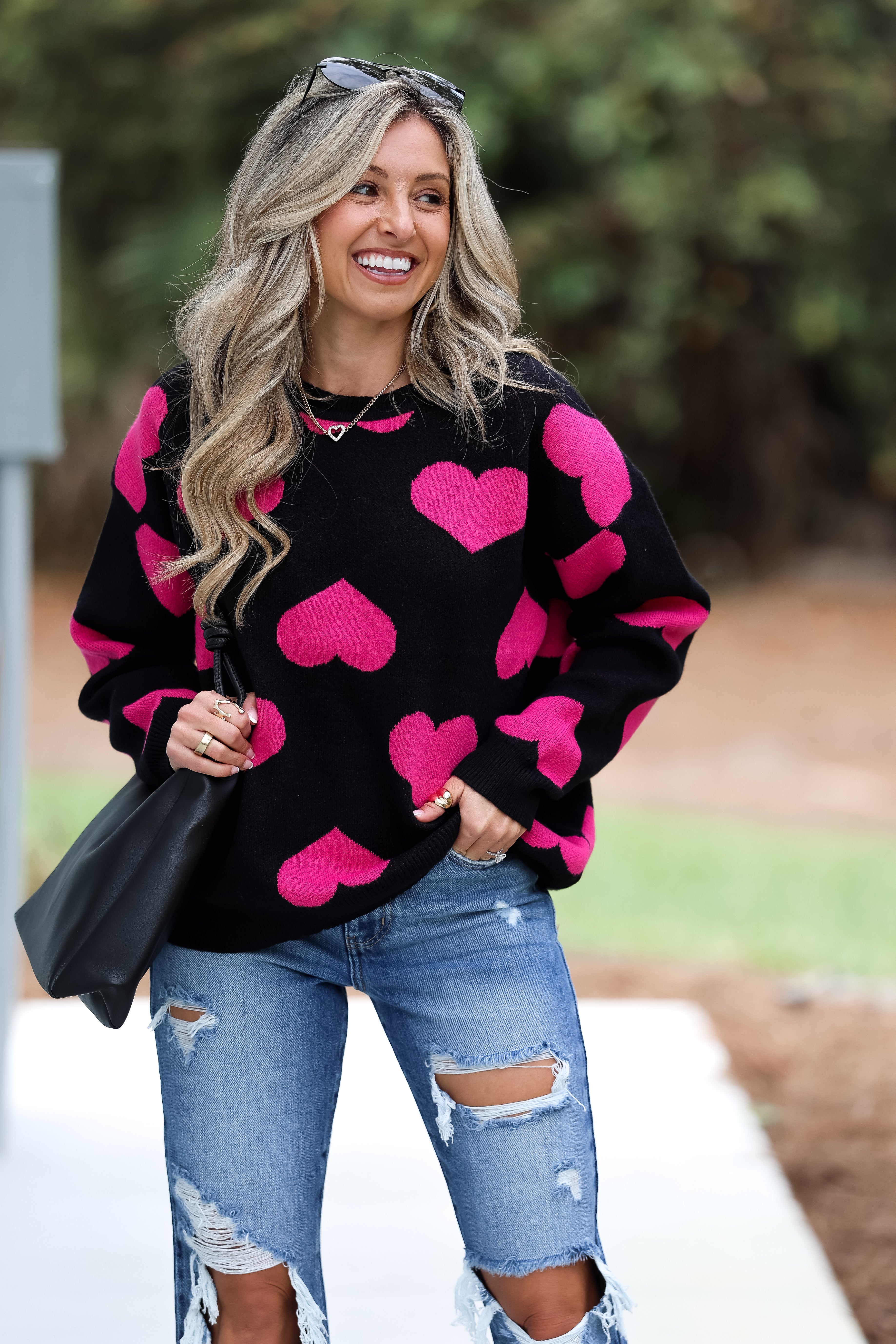 Fall in love with every detail of the Black Endless Love Heart Sweater. This cozy knit features a black base with pink heart accents throughout for a timeless Valentine inspired look you can wear all season long. Designed with a relaxed yet flattering fit, it is perfect for pairing with denim, skirts, or layered over a collared top. Whether you are dressing it up or keeping it casual, this sweater brings a sweet, feminine touch to any outfit.