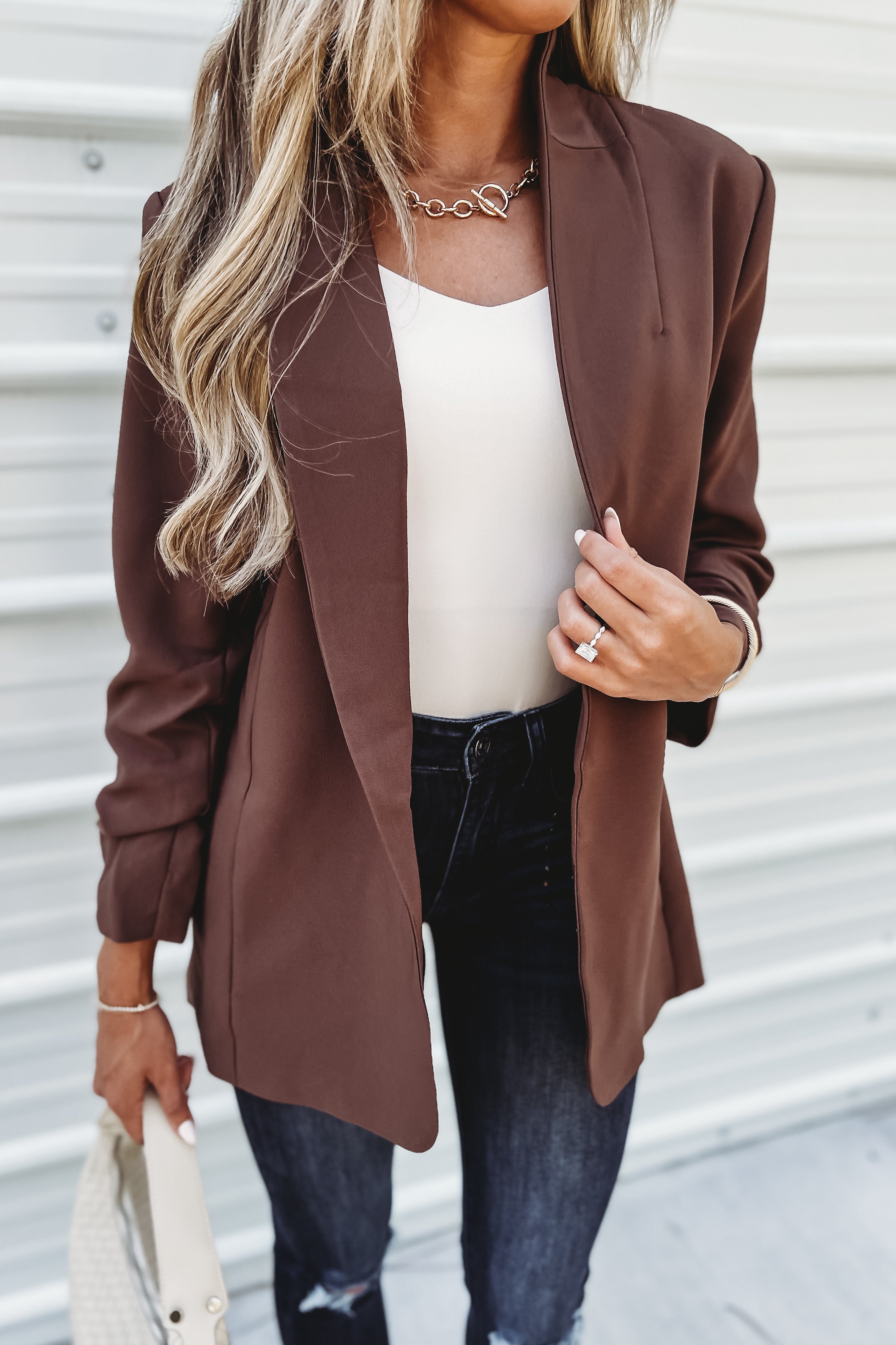 Command attention from boardroom to happy hour in the Power Move Blazer. Featuring a sleek open-front design and ruched 3/4 sleeves this versatile piece layers perfectly over tanks, tees, and blouses. Dress it up with slacks or down with denim but either way, it’s a must have!