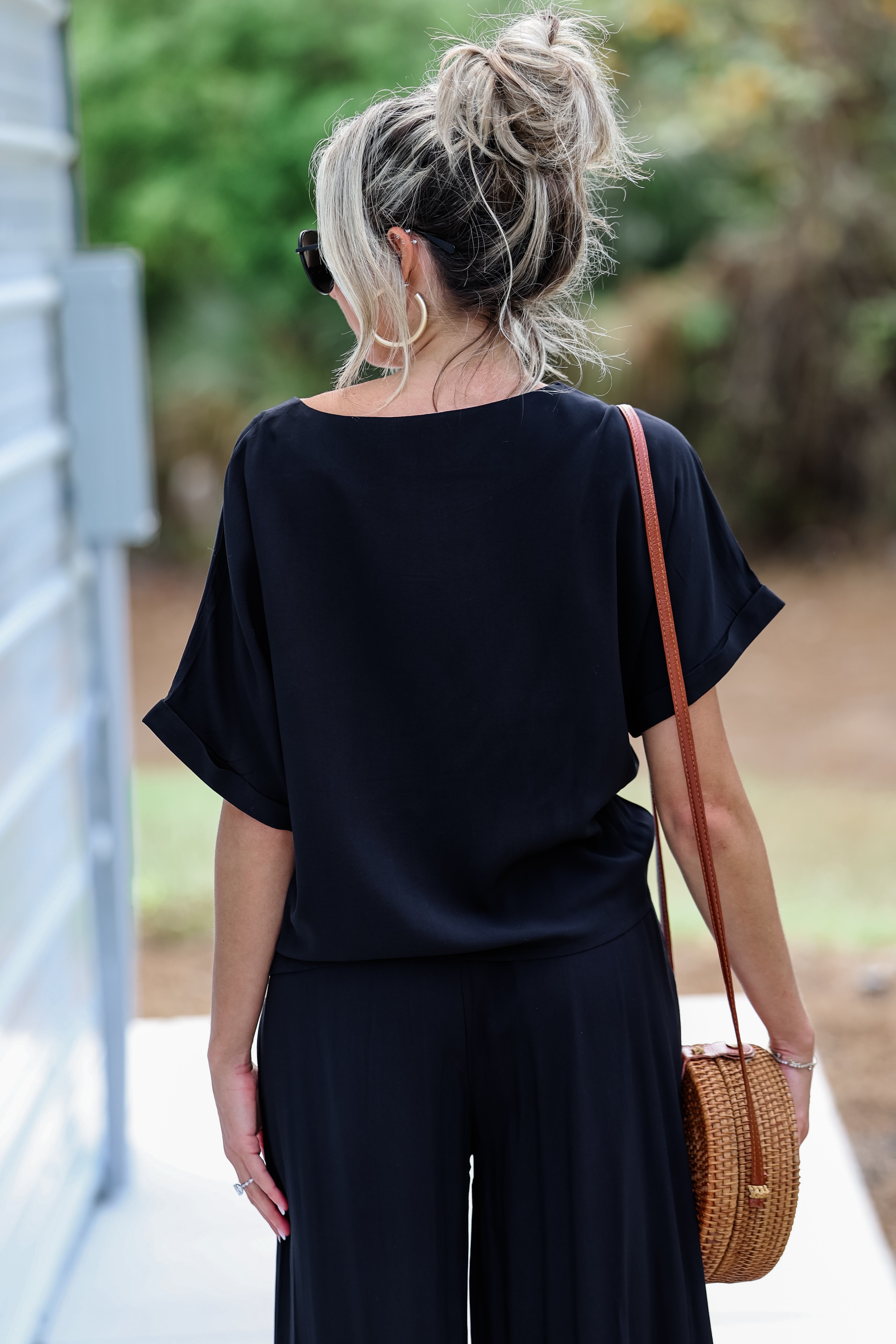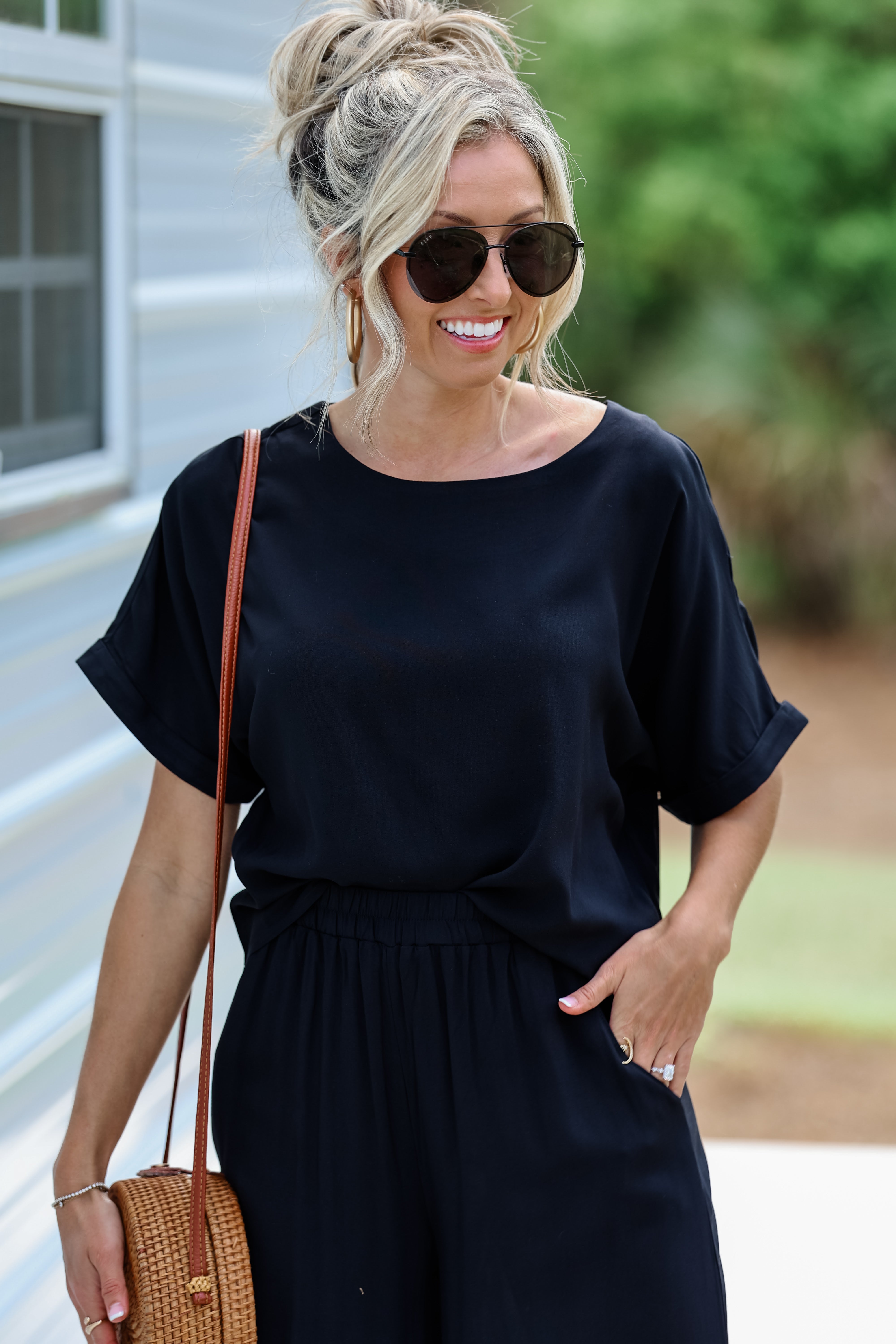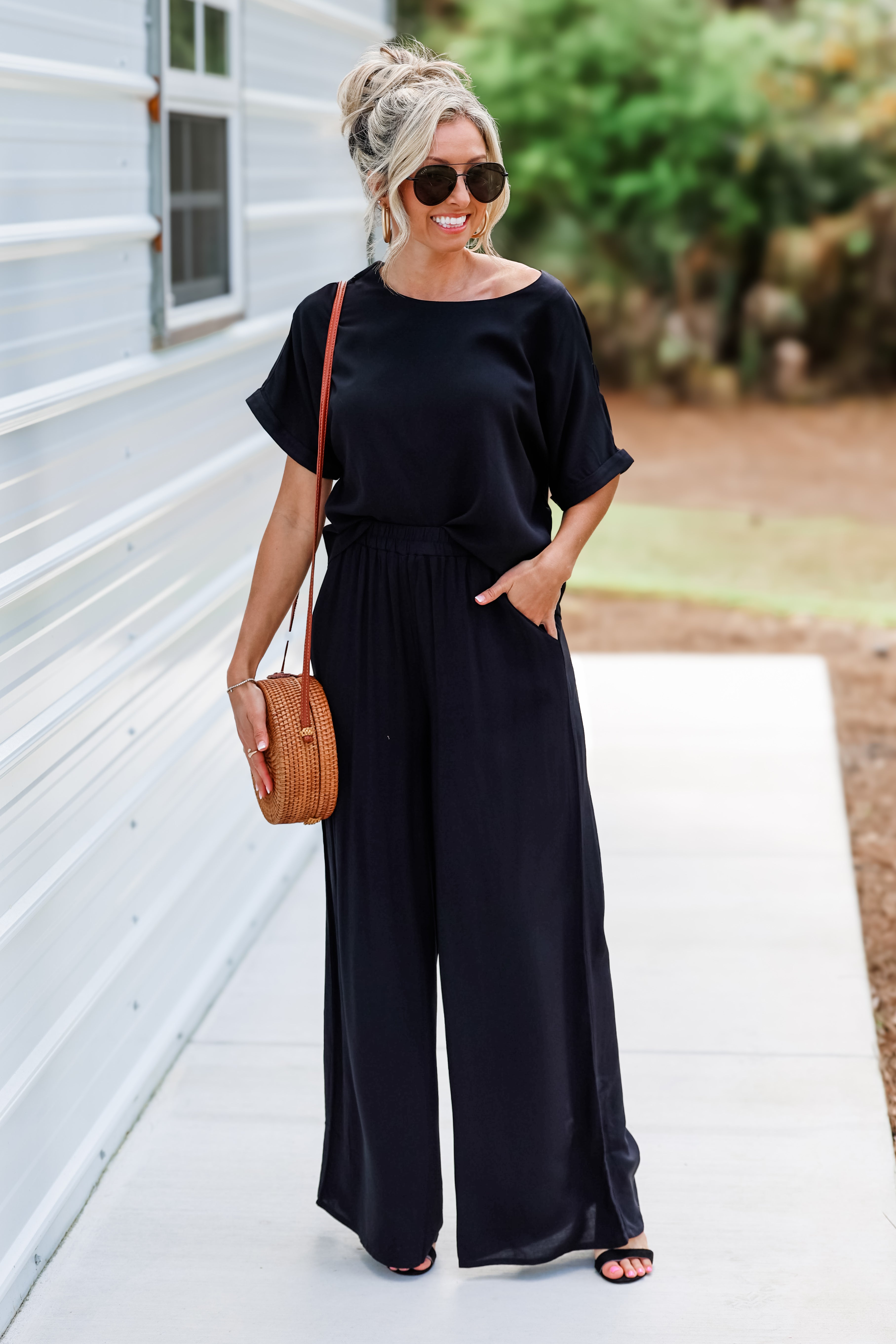 This two piece set features a relaxed-fit cuffed sleeve top and wide-leg elastic waist pants with pockets. Whether you're headed to brunch or working from home, this set makes you look put together without even trying.