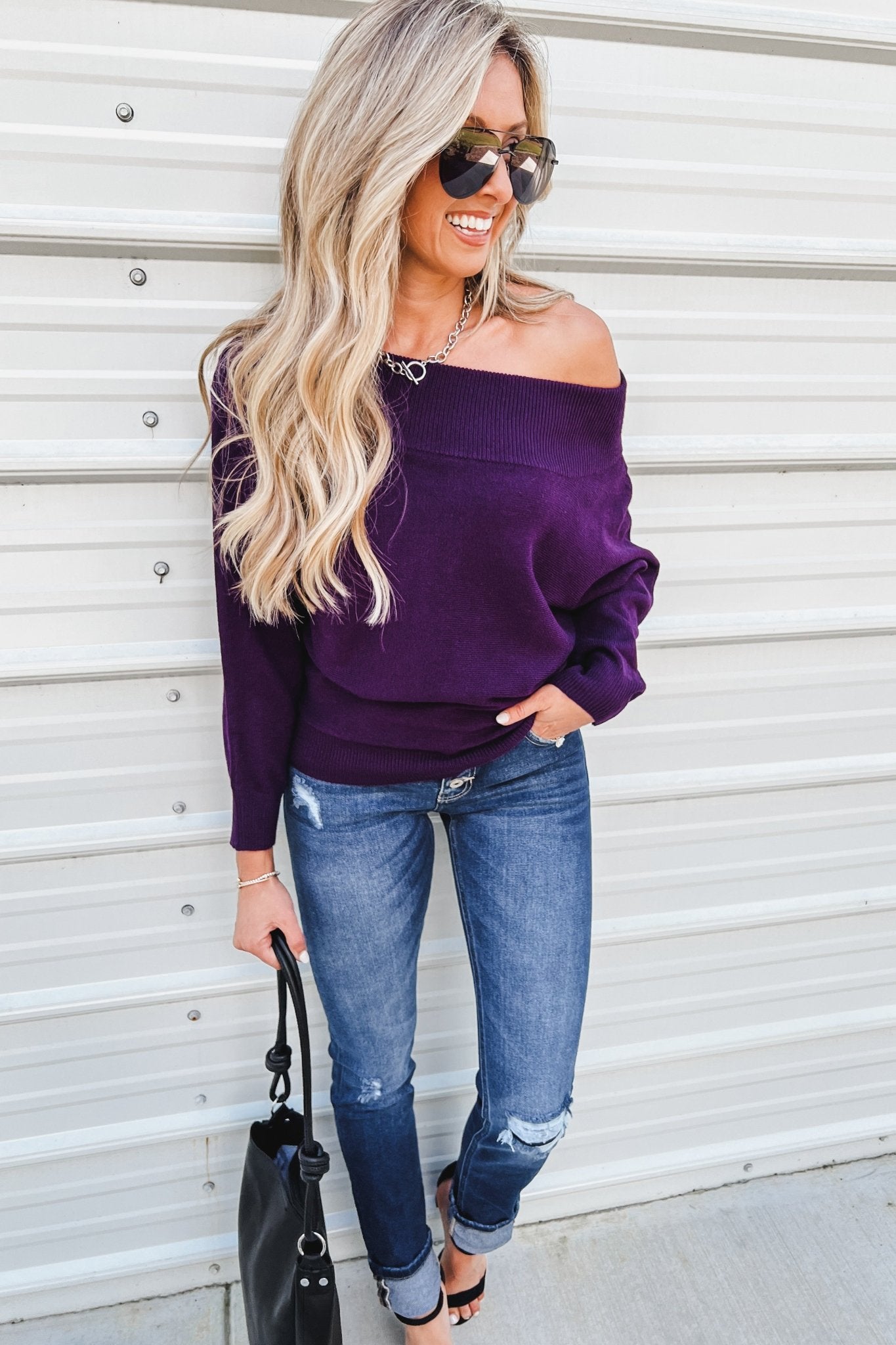 This Skip a Beat Off Shoulder Sweater is perfect for a casual, yet stylish look. Made of soft knit material, it features a trendy off-shoulder design and is available in two beautiful colors - purple and off-white. Pair it with jeans for a cute and comfortable outfit.