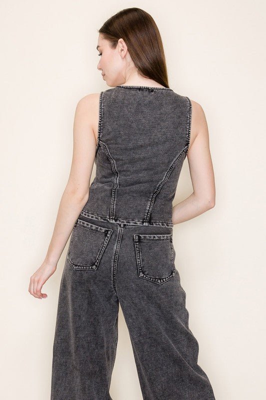 - A sleeveless solid denim vest with a button down front featuring a pocket flaps and a true-to-size fit.