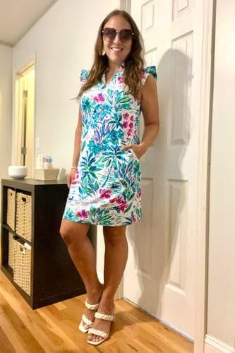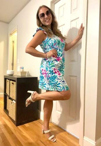 I fell head over heels for the bright colors, tropical print and fun cut of this dress. The scuba material is so easy to move in and forgiving. I’m 5’ 6”, 34DD and 165 lbs and the M (6/8) fit nicely with room to spare.
