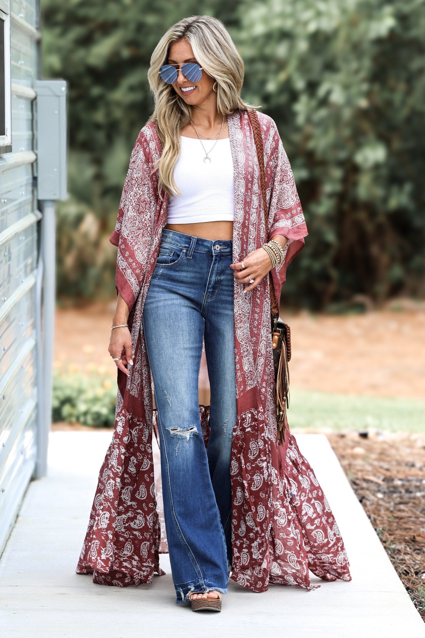Boho and beautiful, the Mia Paisley Tapestry Kimono adds an instant pop to any outfit. Made from lightweight, flowy fabric with a soft drape and allover tapestry-inspired print, it’s that easy layer you’ll reach for again and again. Pair it with denim shorts and a tank, or dress it up with a maxi and boots for concert season.