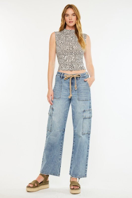 The Katie Baggy Jean gives the perfect trendy oversized look. In a medium wash that easily goes with a basic tee or a lavish top. This style has metal grommets throughout the waist that self-tie string. This style also features a single button closure with a zipper fly, cargo pockets, and knee dart details.