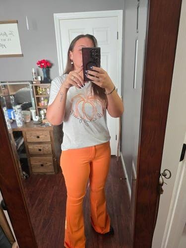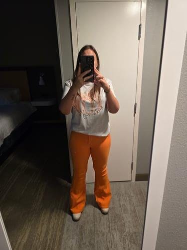 1st picture (at home) is with the pants folded due to being so long on me. The last 2 (at a hotel) is after I had them hemmed. For reference I am 5ft 3, between 145 and 150 pounds and these are a Medium. I have PLENTY of room in the pants. I had several inches taken off due to my height and there is still so much flare! I have these in every color she offers and I'd get more if she had more colors. I get compliments on every single pair. I dress them up to wear to work (office so dress code is business casual) and pop on a t-shirt after work or weekends for comfort. I cannot stress how much I love these pants. I highly recommend them!