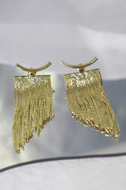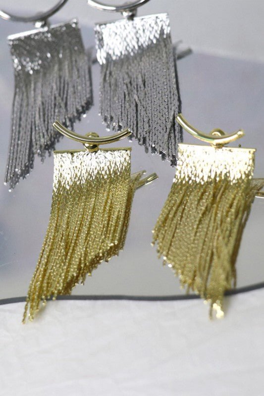 Add a little movement and shine with the Fringe Drop Earrings. These lightweight statement earrings feature sleek cascading chains that shimmer with every turn. Available in gold or silver — bold enough for a night out, yet timeless enough for everyday wear.