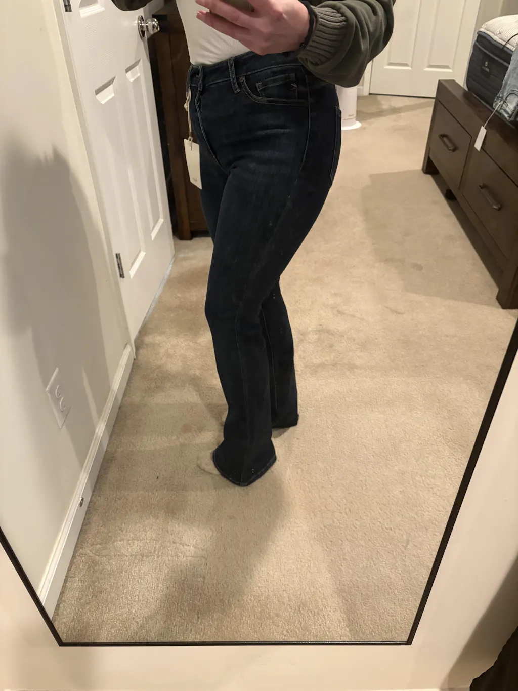 These dark wash boot cut jeans are very flattering. The fit is great and hugs in all the right places.
