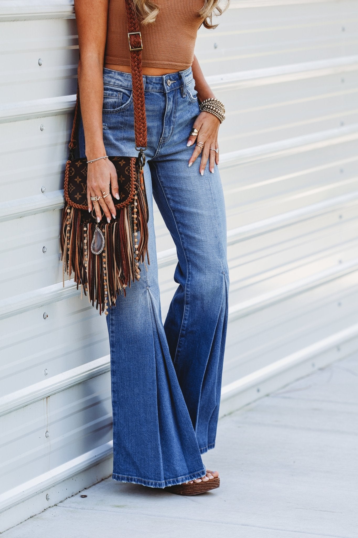 Meet Eve, your new go-to for legs that look miles long. With a flattering high rise and dramatic flare, she’s made to hug your waist and flow with every step. The subtle ombre wash and pleat detail bring a modern twist to a retro-inspired silhouette ... just the right mix of timeless and fun.