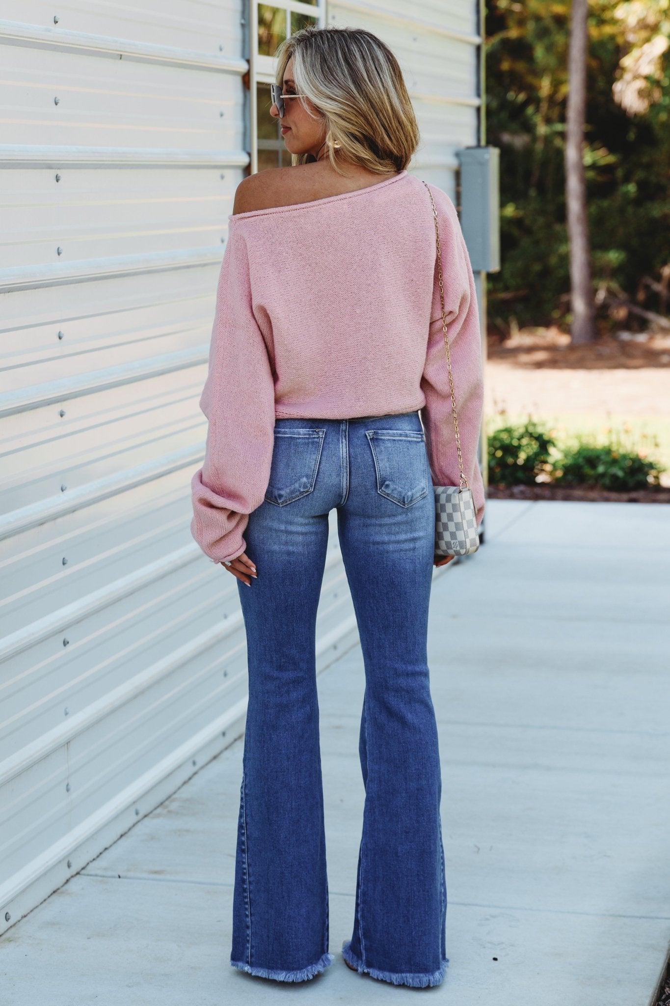 Meet Ruby, your new confidence jeans. This flattering high rise flare hugs your curves through the hips and thighs before kicking out just below the knee for that leg-lengthening, head-turning fit. With its medium wash, subtle fading, and raw hem, Ruby gives off the perfect western style.