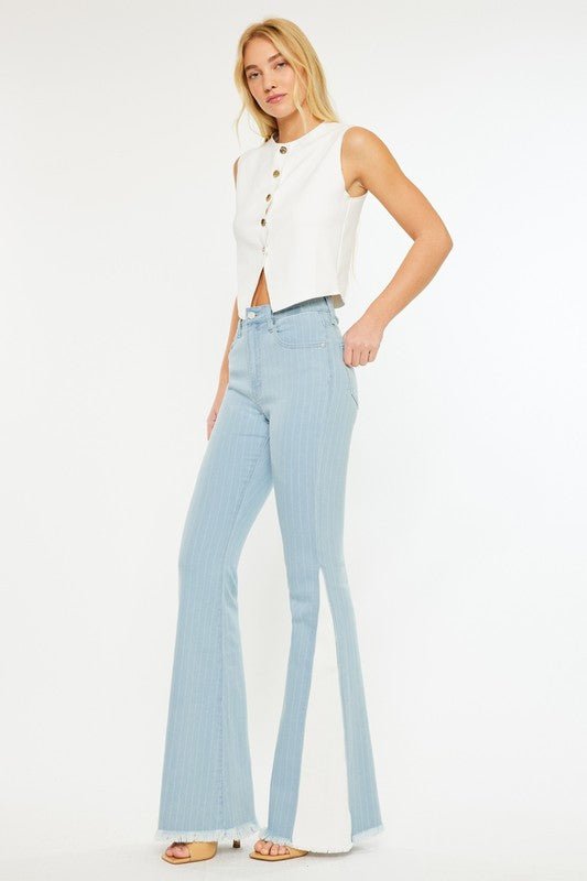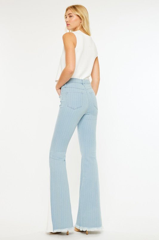 Say hello to London, the flare that knows how to make an entrance. Designed with a high rise and bold wide-leg silhouette, these jeans feature subtle pinstripes and a contrast white side panel that elongates your legs and adds just the right amount of drama.