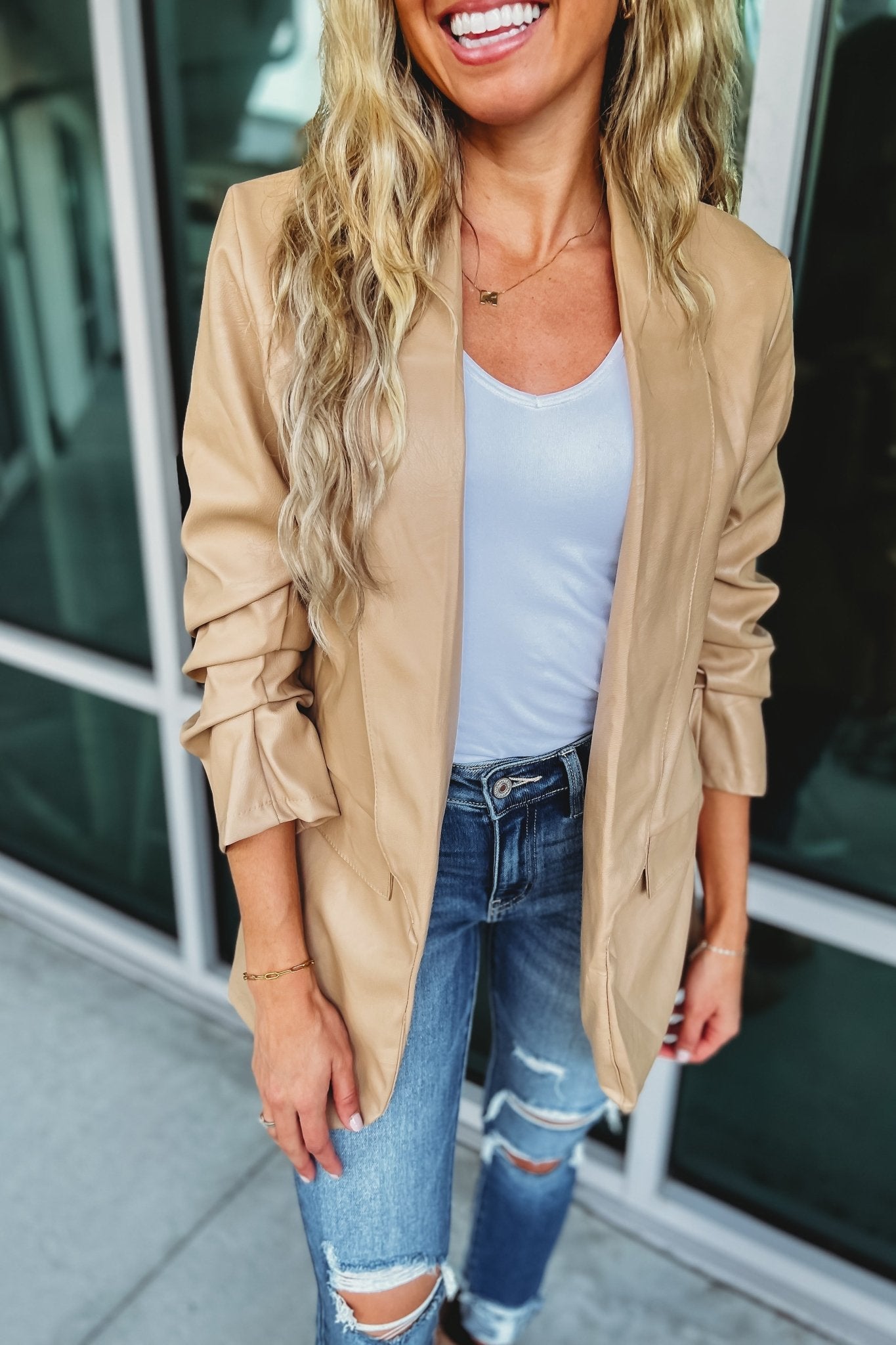 Venti 6 Nothing Can Compare Ruched Sleeve Faux Leather Nude Blazer