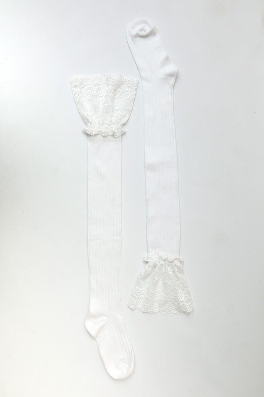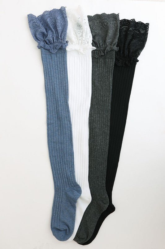 These knee-highs feature intricate lace trim, adding a sophisticated and feminine touch to your look. Made from soft, quality materials, they provide a comfortable fit that's ideal for everyday wear or special occasions. Elevate your sock drawer with these chic, lace-detailed knee-high socks.
